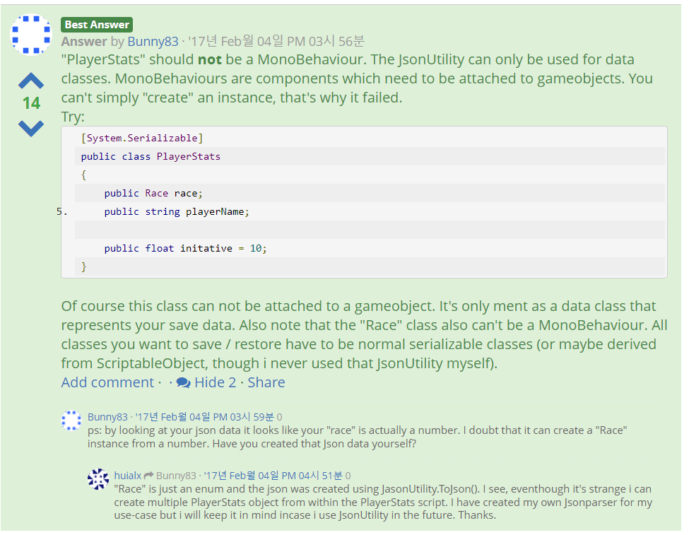 여기서! Json스트링으로는 만들어지지만, Json스트링을 다시 객체로 만들려고 할 때, MonoBehaviour 때문에 객체가 만들어지지 못한다.